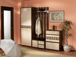 - Корпусная мебель. Такой вариант подойдёт для прихожих с небольшой площадью либо узких. Такая мебель сочетает в себе несколько секций, различные полки, вместительные тумбочки и навесные вешалки.